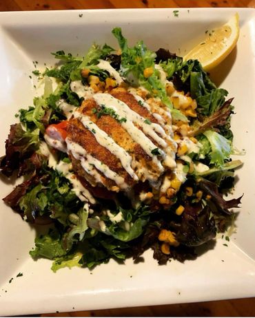 Jumbo scallops served over lemony spring mix with corn & pineapple salsa, mashed potatoes and topped with pancetta 35